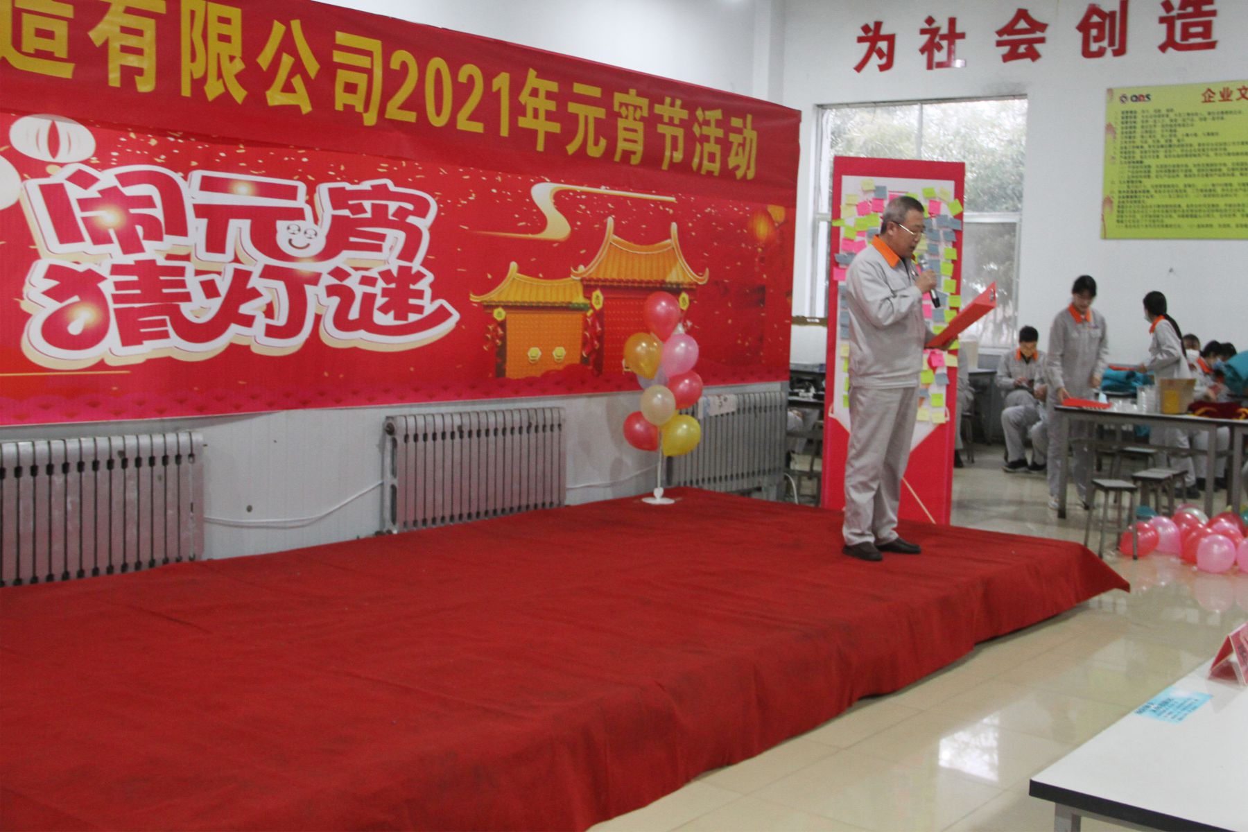為弘揚(yáng)中國傳統(tǒng)元宵節(jié)文化,豐富全體員工文娛生活,營造新春佳節(jié)喜慶、祥和的節(jié)日氛圍,增強(qiáng)員工團(tuán)結(jié)、向上、積極的工作精神,促進(jìn)生產(chǎn)經(jīng)營工作良好發(fā)展。2月25日晚17:20,由公司團(tuán)委牽頭組織的2021年度“猜燈謎、慶元宵”聯(lián)歡晚會在員工餐廳隆重舉行。